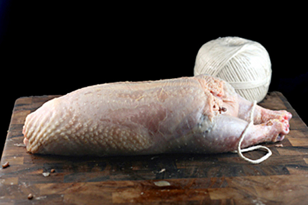 Whole deboned, red rice stuffed chicken for Chicken Ballotine