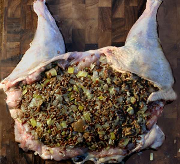 Whole deboned, red rice stuffed chicken for Chicken Ballotine