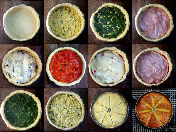 tourte Milanese - layers of herbed scrambled eggs, ham or turkey, garlic spinach, swiss cheese and roasted red peppers encased in puff pastry! A great brunch stunner and easy!